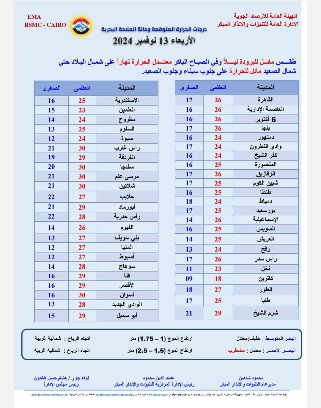 حالة الطقس اليوم ودرجات الحرارة.. يسود اليوم الأربعاء الموافق 13 نوفمبر، طقس معتدل نهاراً على شمال البلاد وحتى شمال الصعيد ومائل للحرارة على جنوب سيناء وجنوب الصعيد.