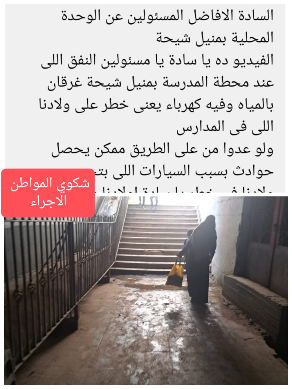 كما قام مركز ومدينة أبو النمرس بالاستجابة للشكوي الواردة الخاصه بوجود تجمعات للمياه بنفق المشاة بشارع المدرسة بمنيل شيحة الامر الذي يمثل خطورة على سلامه المواطنين حيث تم شفط تجمعات المياه وإجراء الصيانات اللازمة وإزالة اسباب الشكوي.