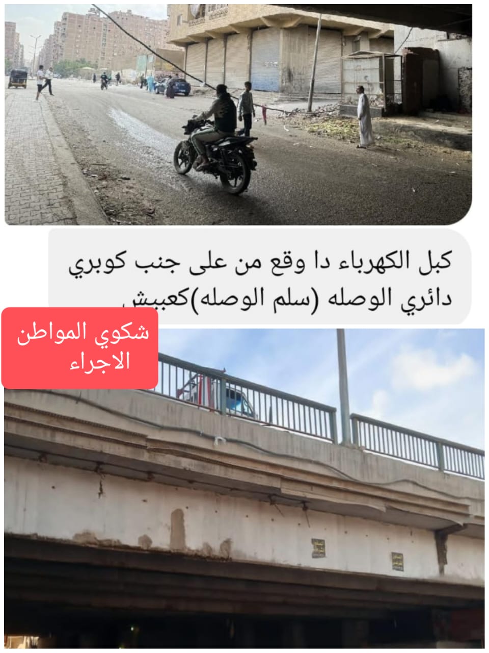 وتم التنسيق مع الهيئة العامة للطرق والكباري ورفع الكابل وإزالة أسباب الشكوي حفاظا على سلامة المواطنين مع المراجعة الدورية لكافه اعمدة الإنارة والكابلات الكهربائية بالقطاع.