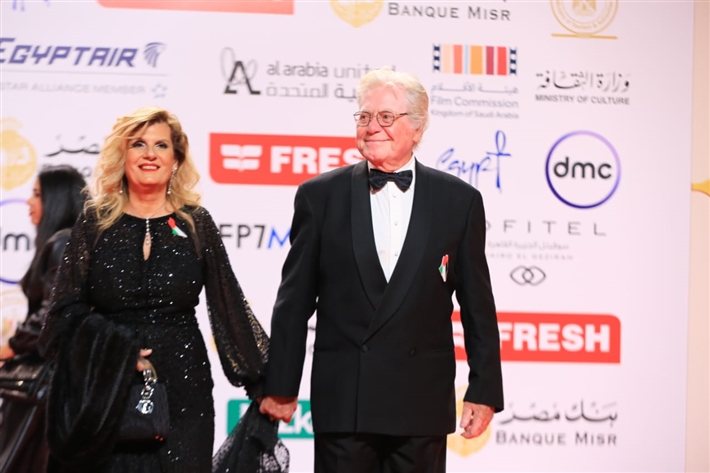 من بين الحاضرين الأوائل على السجادة الحمراء كان الفنان الكبير حسين فهمي، رئيس مهرجان القاهرة السينمائي الدولي، الذي وصل بصحبة زوجته.