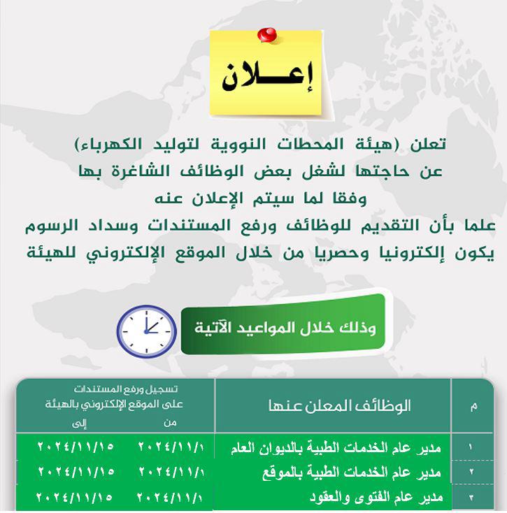 مع بداية الاسبوع القادم ينتهي موعد إعلان هيئة المحطات النووية لتوليد الكهرباء، عن حاجتها لشغل وظائف خالية شاغرة بها، وذلك يوم الأحد المقبل.