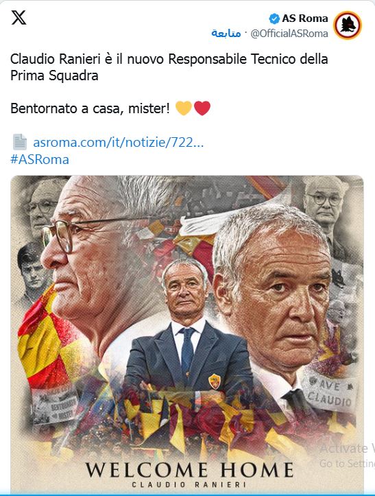 رحب نادي روما الإيطالي عبر حسابه الرسمي على موقع التواصل الاجتماعي “إكس”، بالمدرب كلاوديو رانييري الذي أصبح مديرًا فنيًا لتدريب الفريق في الفترة المقبلة.