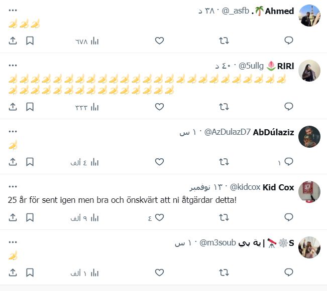 أدى تسريب إيميل من حساب وزيرة المساواة السويدية بولينا براندبيرغ، إلى تحويل جميع التعليقات على حسابها في منصة إكس، لرمز الموز، بعدما طلبت في الإيميل الذي تسرب من جميع الموظفين عدم اصطحاب الموز لأنها تخاف منه.
