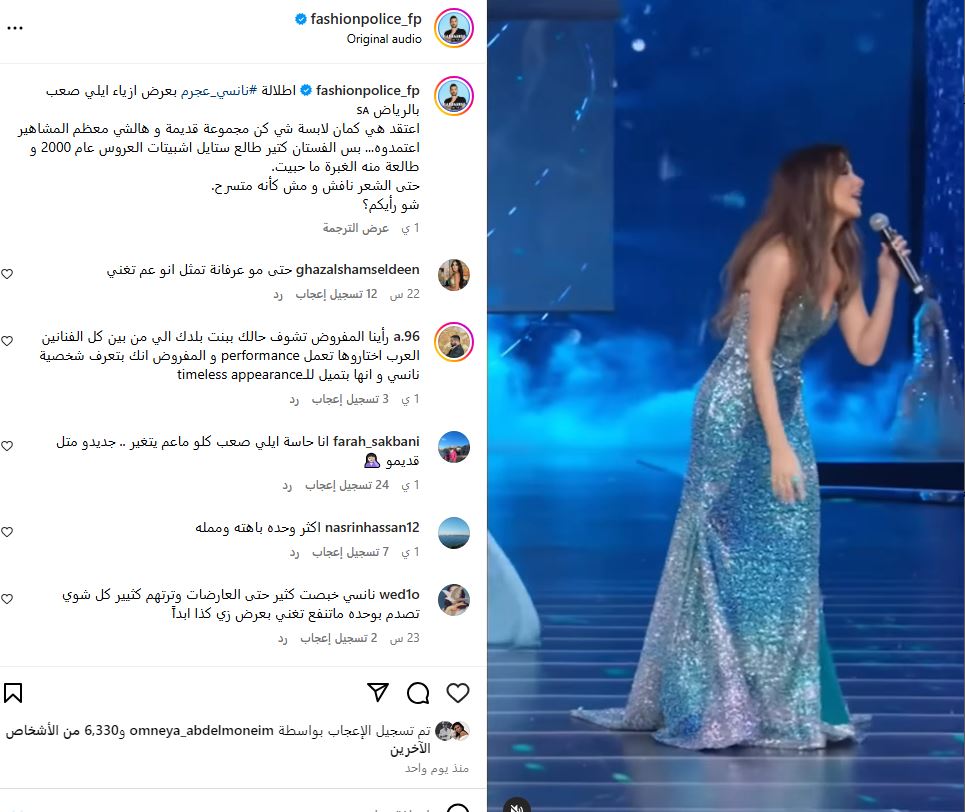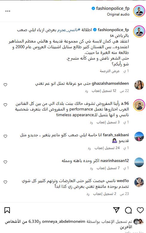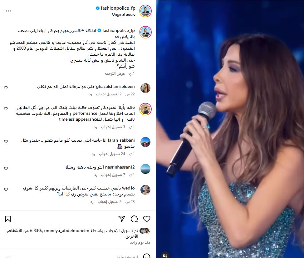وجاء تعليق إيلي حنا عبر الصفحة الرسمية لشرطة الموضة بالإنستجرام، قائلًا: " اطلالة نانسي عجرم بعرض ازياء ايلي صعب بالرياض، اعتقد هي كمان لابسة شي كن مجموعة قديمة و هالشي معظم المشاهير اعتمدوه".