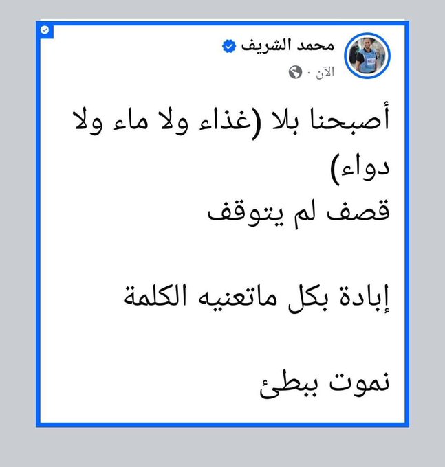 وكان من أبرز منشورات الصحفي محمد الشريف : “أصبحنا بلا غذاء ولا ماء ولا دواء، قصف لا يتوقف، وإبادة بكل ما تعنيه الكلمة، نموت بالبطيئ، نتحدث لكم من مخيم جباليا وشمال غزة".