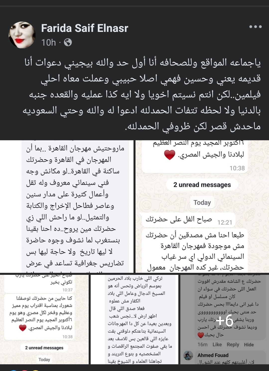 وكتبت فريدة عبر حسابها الرسمي على "فيسبوك" قائلة: "أنا أول من يصلني الدعوات، أنا قديمة في المجال وحسين فهمي حبيبي وقدمت معه أفضل فيلمين، لكن يبدو أنكم نسيتوا أخويا".