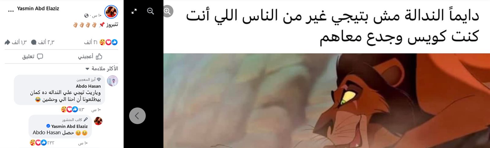 على الفور تفاعل المتابعون بشكل كبير مع المنشور ياسمين عبدالعزيز، حيث علّق أحدهم: “يا ريت تيجي على الندالة، ده كمان بيطلعونا إن إحنا إلي وحشين"، وردت عليه ياسمين قائلة: “حصل”، بينما كتب آخر: “وصلتك متأخر يا فنانه ده من زمان اووي ربنا يحفظك ويبعد المنافقين من طريقك”.