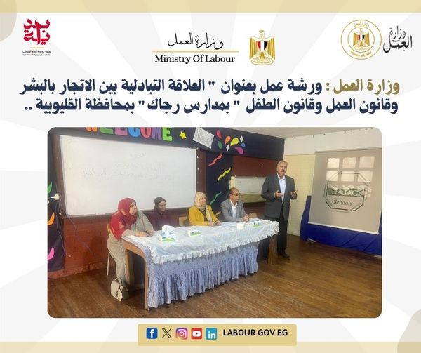 نظمت مديرية العمل بمحافظة القليوبية، ورشة عمل بعنوان "العلاقة التبادلية بين الاتجار بالبشر وقانون العمل وقانون الطفل "، وذلك بمدارس رجاك الدولية بمنطقة العبور، بحضور عدد 38 من ممثلي المنشآت.