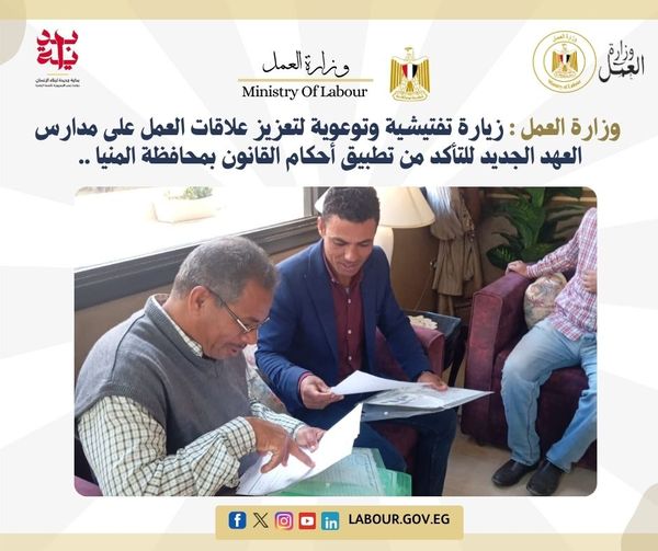 نظمت مديرية العمل بمحافظة المنيا، نظمت زيارة تفتيشية نهارية شاملة على مدارس العهد الجديد ، بواقع ( 52 عربى - ولغات 35 )، قامت بها المديرية بالتعاون مع مكتب عمل تفتيش عمل سمالوط ، للتفتيش والتوعية العمالية.