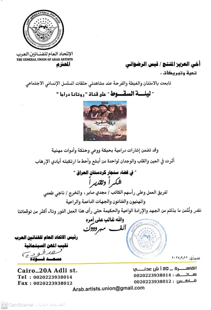 الدراما التليفزيونية، الوسيلة الأفضل لتوثيق حياة الشعوب، وتكشف فى اطار مشوق، مايصعب على وسائل الإعلام أن تتذكره، لأنها تقدم التاريخ للمتلقى بشكل جذاب بعيدًا عن جمهور الكتب وتعقيدات الوثائق، وهو ما نجح فيه وبقوة مسلسل " ليلة السقوط " الذى كشف الإرهاب الداعشى الوحشي غير الإنساني في أسر وقتل واغتصاب السبايا الأيزيديات فى قضاء سنجار العراق فى الفترة من 2014 وحتى 2017، ليكون أول عمل فنى على مستوى العالم يوثق للاعتداءات التى تعرض لها الأيزيديات ويقدم بطلة للعمل شخصية منهم، وهو ما جعل نقابة السينمائيين المصرية ترسل خطاب شكر لفريق العمل والمنتج د. قيس الرضوانى، وتقول فى البيان "نقدر ونثمن ما بذلتم من الجهد والإرادة الواعية والحكيمة حتى رأى هذا العمل النور".