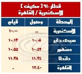 كما تقرر تشغيل قطار 910 مكيف الإسكندرية / القاهرة ( خدمة جديدة ) حيث يقوم من محطة الإسكندرية الساعة 10:00 صباحاً ويصل محطة القاهرة الساعة 12:40 طبقاً للجدول المرفق وبنفس تركيب قطار 2007.