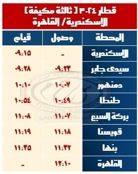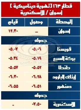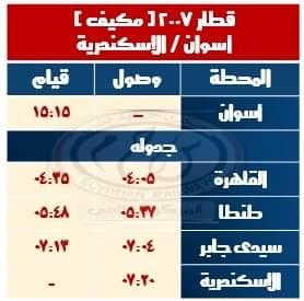حيث تقرر إمتداد مسير قطار 2007 مكيف أسوان / القاهرة والذى يقوم من محطة أسوان يوم 30 / 11 / 2024 الساعة 15:15 ويصل محطة القاهرة الساعة 04:05 صباح يوم 1 / 12 / 2024 ويمتد مسيره إلى محطة الإسكندرية كخدمة جديدة ليصلها الساعة 07:20 صباحاً طبقاً للجدول المرفق.