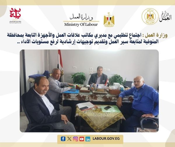 نظمت مديرية العمل بمحافظة المنوفية، اجتماعا تنظيميا مع مديري مناطق العمل و مديري ومفتشي مكاتب علاقات العمل بالمنوفية ، بمقر مكتبه بديوان عام المديرية ، وذلك لمتابعة سير العمل اولا باول بالمناطق والمكاتب التابعة ، ورصد معوقات العمل والسعي نحو حلها ، لتحقيق أفضل النتائج المنشودة وحفاظا على استقرار علاقات العمل بالمنشآت ، تم خلال الاجتماع مناقشة القواعد الفنية لبحث الشكاوى وترسيخ مفاهيم وأسس علاقات العمل الجماعية التي أكد عليها قانون العمل ، بين طرفي علاقة العمل ( أصحاب الأعمال والعمال ) وعلى رأسها المفاوضة الجماعية.