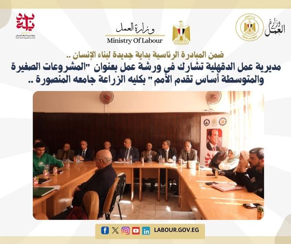 شاركت مديرية العمل بمحافظة الدقهلية، من خلال إدارة التدريب المهنى فى حضور ورشة العمل المنفذة بقسم الاقتصاد الزراعي بكلية الزراعة جامعة المنصورة، ومائدة مستديرة حول موضوع (المشروعات الصغيرة والمتوسطة أساس تقدم الأمم)، بمشاركة مجموعة من الخبراء بالجهات ذات الصلة بورشة العمل منها: وزارة التضامن الاجتماعي، وحاضنات الأعمال، وجهاز تنمية المشروعات، والبنك الزراعي المصري ، والغرفة التجارية، وإدارة التدريب المهني بمديرية العمل.