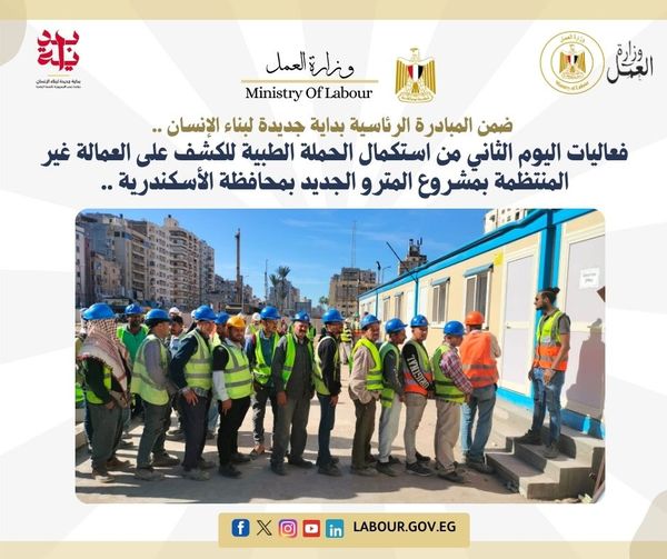 وقد سبق الكشف على عدد 200 عامل باليوم الأول، بالتنسيق مع شركات المقاولات وجهات التنفيذ بالمشروع وهى: شركة أوراسكوم، حيث يستهدف توقيع الكشف على جميع العاملين بمواقع المترو الجديد وعددهم 600 عامل غير منتظم، يأتى ذلك فى إطار جهود المديرية للتنسيق والتواصل المستمر بين إدارة العمالة غير المنتظمة والشركات العاملة داخل نطاق المحافظة لتوفير الحماية والرعاية اللازمة لتلك الفئة اجتماعيا وصحيا، تحت إشراف الإدارة المركزية لرعاية العمالة غير المنتظمة بالوزارة.