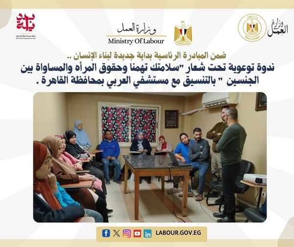 نظمت مديرية العمل بمحافظة القاهرة، فعاليات مبادرة "سلامتك تهمنا" لنشر ثقافة السلامة والصحة المهنية ، بالتنسيق والتعاون بين ادارة شؤون المرأة ومكتب السلامة والصحة المهنية بروض الفرج، بمقر مستشفى العربي الطبي، بحضور عدد 16 عاملا.