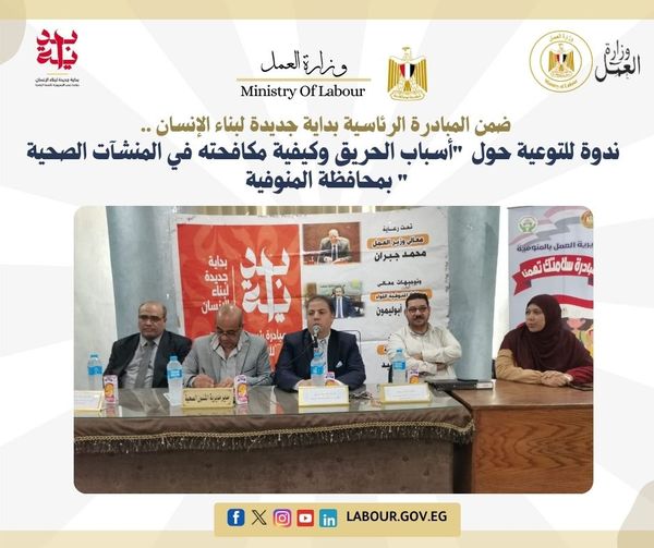 وقال عماد سعيد مدير مديرية العمل بالمنوفية، إن تلك الندوات تأتي تنفيذاً لتوجيهات وزير العمل محمد جبران ، لمديريات العمل بالمحافظات، بتكثيف الجهود والتعاون مع كافة الوزارات والجهات المعنية ، لُسرعة تحقيق أهداف المبادرة الرئاسية "بداية جديدة لبناء الإنسان"، التي أطلقها رئيس مجلس الوزراء د. مصطفى مدبولي ، لتحسين جودة الحياة لجميع المواطنين في مختلف أنحاء الجمهورية ، وتقديم الخدمات الحكومية في مجالات: التعليم، والصحة، والثقافة، والرياضة، والتوظيف، بطريقة تكاملية بين مختلف الجهات المشاركة، وتنظيم ندوات توعوية ،تحت شعار "سلامتك تهمنا"، بالتنسيق مع القطاع الخاص، وذلك في مجالات نشر ثقافة "السلامة والصحة المهنية" للحفاظ على صحة العامل ، وسلامة أدوات الإنتاج ، وتحقيق بيئة عمل لائقة وصحية.
