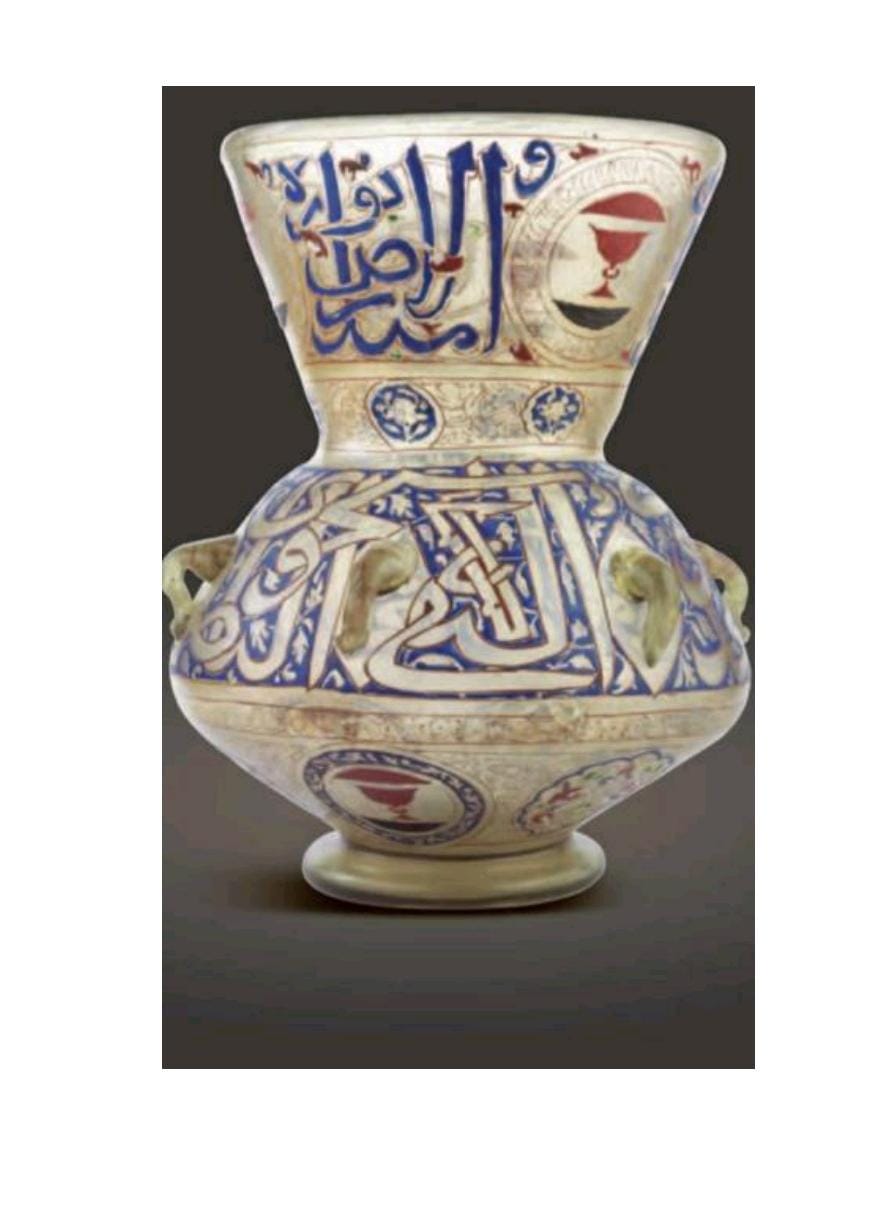 يعرض مشكاة الأمير "قوصون" من الزحاج المذهب المموه بالمينا على الطراز المملوكي على رقبتها كتابة وزخارف نباتية وطائر يشبه الطاووس وأسماك سابحة.