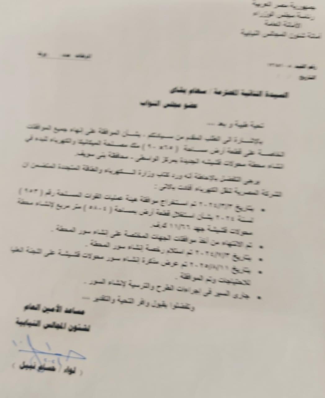 وتابعت "بشاي" فى طلبها ، بأنه فى ٢ / ٣ / ٢٠٢٤ تم استخراج موافقة هيئة عمليات القوات المسلحة رقم ٩٥٣ لسنة ٢٠٢٤م ، بشأن استغلال قطعة الأرض لصالح إنشاء تحديث محطة محولات قشيشة، وتم الانتهاء موافقة الجهات المختصة لانشاء سور حولها وفى ٣ / ٧ / ٢٠٢٤ تم استلام رخصة الإنشاء.