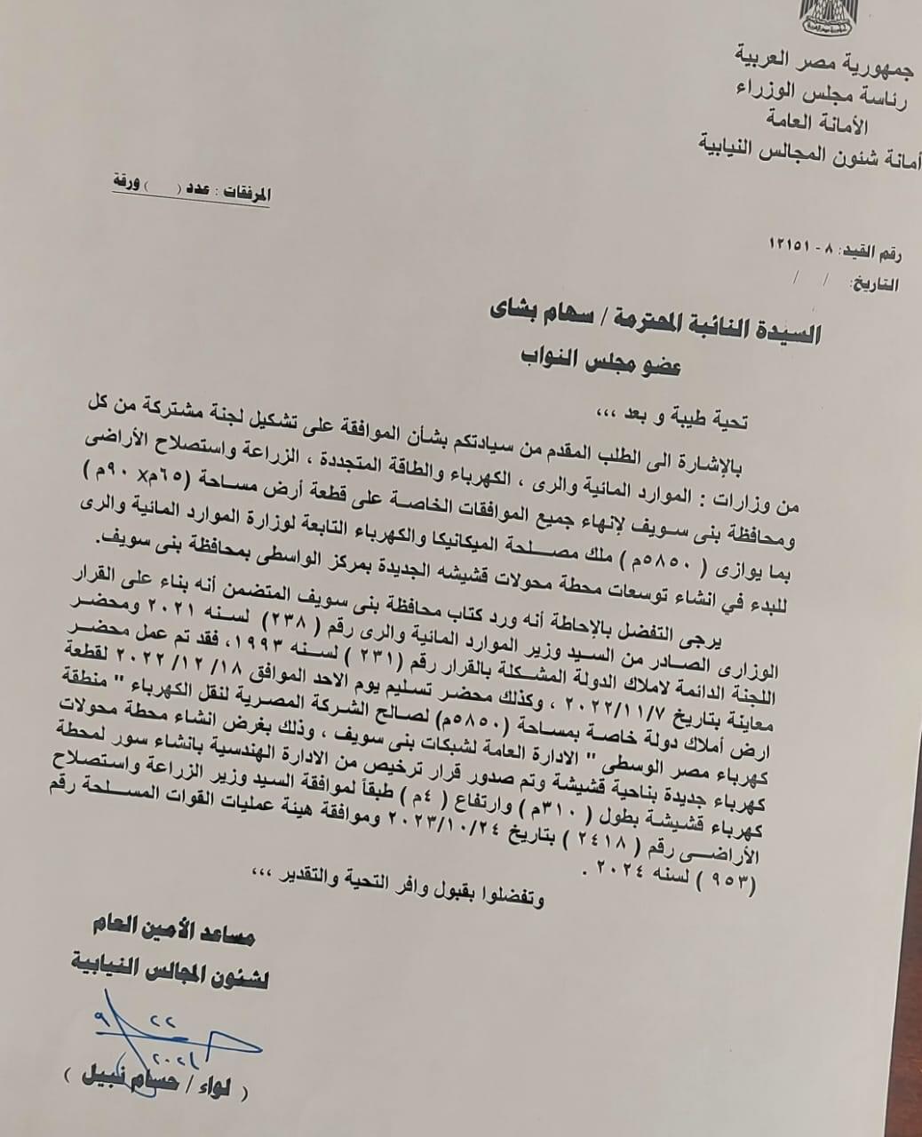 النائبة سهام بشاي تنهى موافقات تحديث محطة محولات كهرباء قشيشة ببنى سويف