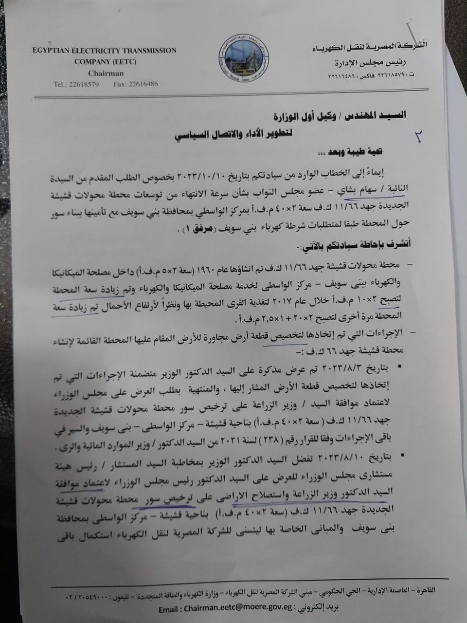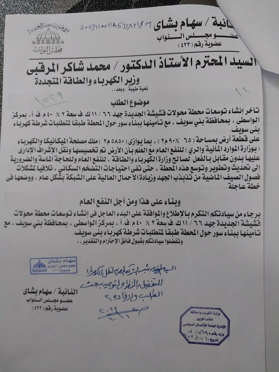 تقدمت النائبة سهام بشاي، عضو مجلس النواب بمذكرة للدكتور مصطفى مدبولى، رئيس مجلس الوزراء، بشأن تأخر تحديث محطة محولات كهرباء قشيشة ، بمركز الواسطى شمال بنى سويف، تلافياً لمشكلات تذبذب الجهد وزيادة الأحمال العالية على الشبكة بشكل عام.