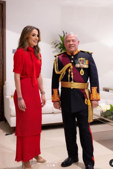 وجاءت إطلالة الملكة رانيا العبدالله ساحرة مواكبة لأحدث صيحات موضة 2025، بأسلوب عصري حديث، مرتديه بلوزة ونسقت عليها جيب بلبيسية راقية التصميم باللون الأحمر الصارخ لتظهر مثل زهرة الحب التي تضم افراد العائلة الملكية.