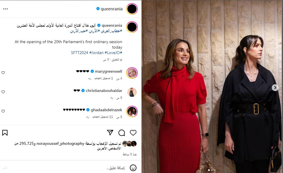 سمة الاحتشام والرقي ترافق الملكة رانيا العبدالله والأميرة رجوة الحسين ليخطفان عدسات الصحافة والإعلام بحضورهما خطاب العرش للعاهل الأردني الملك عبدالله الثاني، خلال افتتاح مراسم الدورة العادية الأولى لمجلس الأمة العشرين.