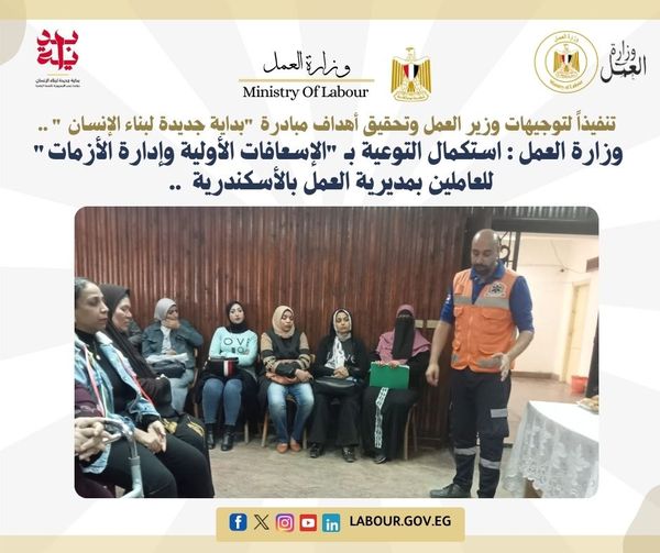 وزارة العمل تستكمل التوعية بـ "الإسعافات الأولية وإدارة الأزمات" للعاملين بالإسكندرية