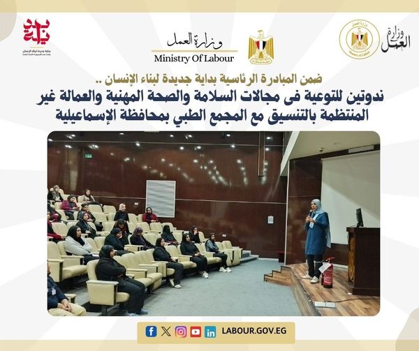 وزارة العمل تنظم ندوتين للتوعية بالسلامة والصحة المهنية والعمالة غير المنتظمة بالإسماعيلية