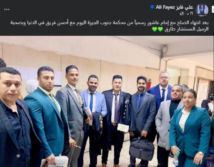 ونشر فايز عبر حسابه الرسمي على موقع "فيس بوك" صورة تجمعه مع المستشار طارق، معلقًا: "تم الانتهاء من التصالح رسميًا مع إمام عاشور في محكمة جنوب الجيزة اليوم، مع أحسن فريق في الدنيا".