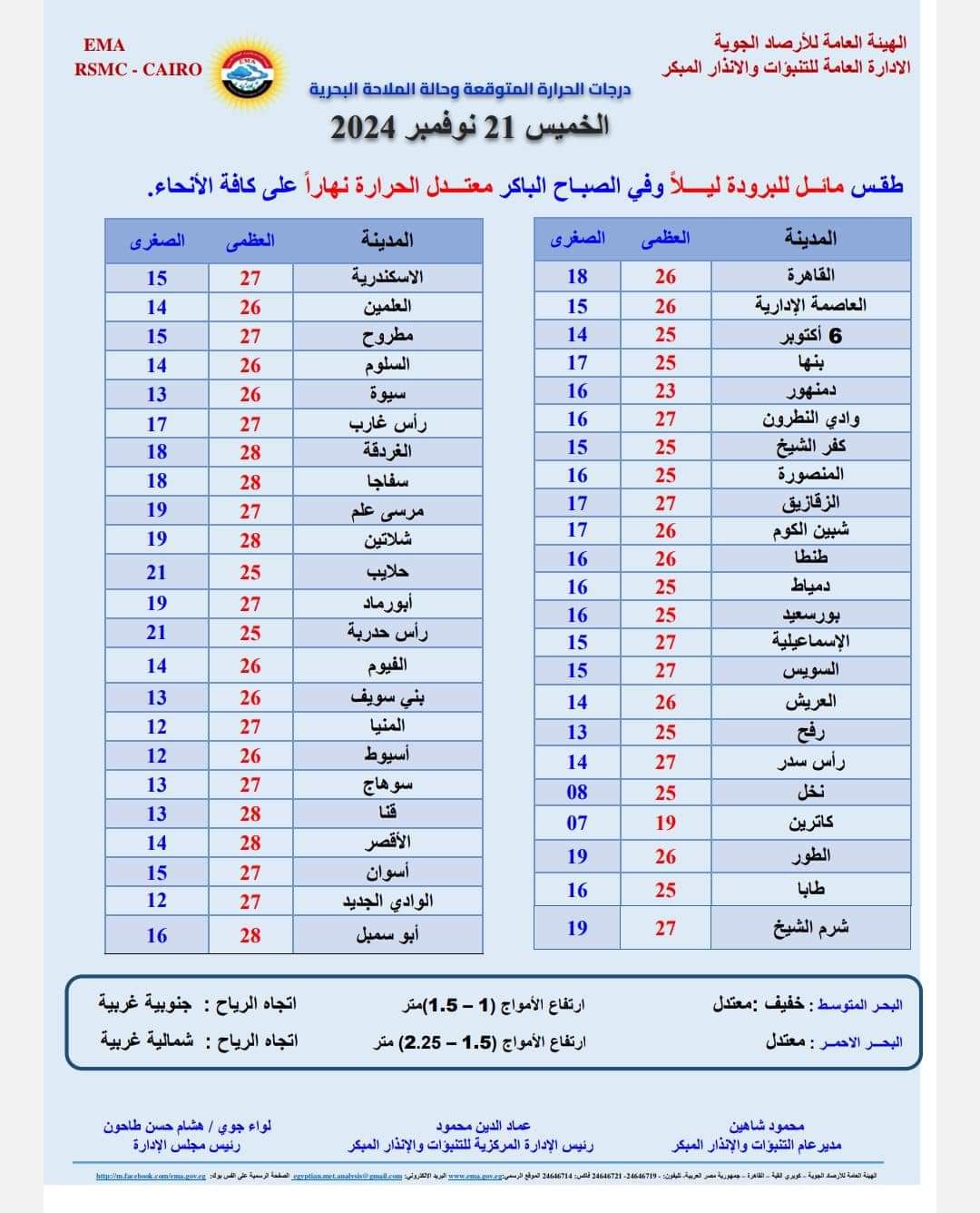 أما عن طقس اليوم الخميس 21 نوفمبر، فتوقعت الهيئة أن يكون معتدل الحرارة نهارًا على المحافظات كافة ومائل للبرودة ليلًا، مع تساقط أمطار خفيفة على السواحل الشمالية الغربية وشمال الوجه البحري.