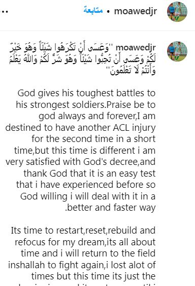 الله يعطي أصعب معاركه لأقوى جنوده، الحمد لله دائمًا وأبدًا، أنا مقدر لي أن أتعرض لإصابة أخرى في الرباط الصليبي للمرة الثانية في وقت قصير، لكن هذه المرة مختلفة، أنا راضٍ جدًا عن قضاء الله، والحمد لله أنه اختبار سهل مررت به من قبل، لذا فإنني بإذن الله سأتعامل معه بشكل أفضل وأسرع".