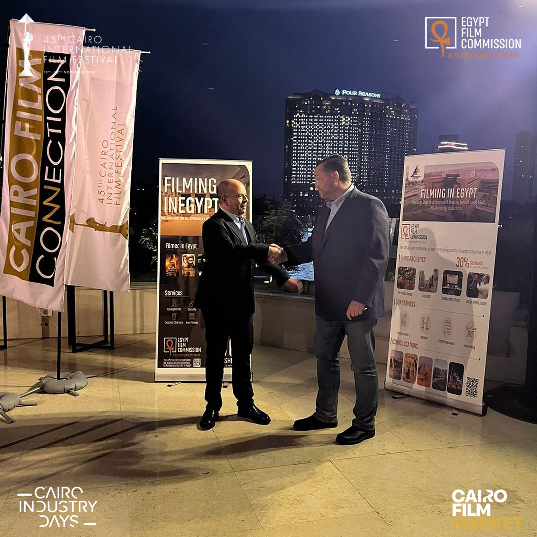شهد سوق القاهرة السينمائي، المنعقد ضمن فعاليات الدورة الـ45 من مهرجان القاهرة السينمائي الدولي، توقيع بروتوكول تعاون بين أحمد بدوي، مدير عام لجنة مصر للأفلام، وجون راكيش، رئيس رابطة مديري مواقع التصوير بالعالم.