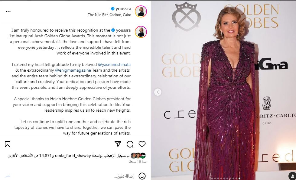 واحتفت جولدن جلوب، باثنين من أبرز نجوم السينما العربية، النجمين المصريين يسرا وحسين فهمي، بمنحهما جائزة عمر الشريف،  تقديرًا لمساهماتهما الكبيرة في إثراء السينما العربية ودورهما الفاعل في تطوير صناعة الترفيه والإنتاج الفني في منطقة الشرق الأوسط.