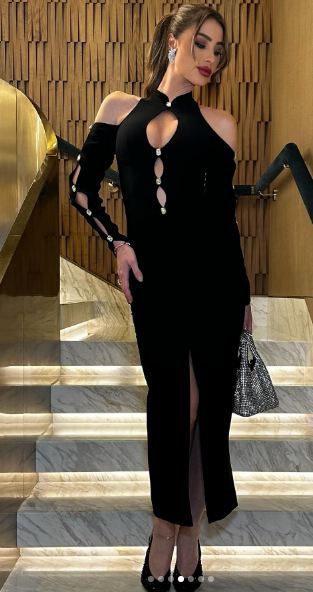 وبدت أنابيلا هلال بإطلالة أنوثية تميل للجرأة تتناسب مع السهرات المسائية برفقة شريك حياتك، حيث ارتدت فستانًا طويلًا مجسمًا، بأكمام طويلة، اتسم بفتحات من الصدر وشق مثير كشف عن ساقها، صمم من قماش ناعم باللون الأسود، الفستان عكس قوامها الرشيق، فيما انتعلت صندلًا بكعب عال.