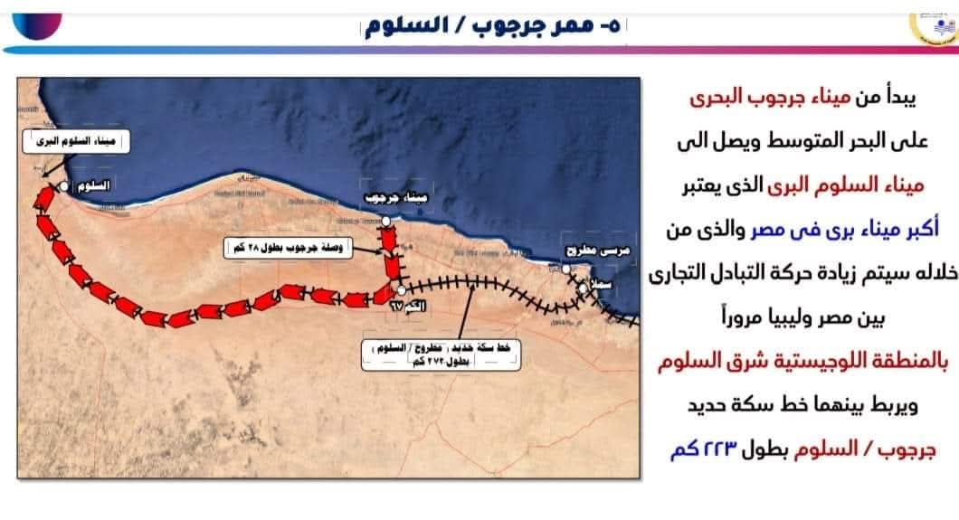 وكذلك ممر جرجوب – السلوم اللوجيستي الذي يبدأ من ميناء جرجوب البحري على البحر المتوسط ويصل الي ميناء السلوم البري الذى يعتبر أكبر ميناء بري في مصر والذى من خلاله سيتم زيادة حركة التبادل التجاري بين مصر وليبيا مروراً بالمنطقة اللوجستية شرق السلوم ويربط بينهما خط سكة حديد جرجوب / السلوم بطول 223 كم  بالإضافة الى ممر  القاهرة – اسوان – ابو سمبل اللوجيستي الذي يشمل الخط الثاني من شبكة القطار الكهربائي السريع وطريق الصعيد الصحراوي الغربي مروراً بالموانئ البرية الجافة والمناطق اللوجستية ( الفيوم الجديدة – كوم أبو راضي – سوهاج الجديدة – أبو سمبل ) ومناطق الاستصلاح الزراعي بتوشكى وشرق العوينات ومنطقة أبو سمبل السياحية وأخيرا  ممر سفاجا – قنا – ابو طرطور اللوجيستي الذي يبدأ من ميناء سفاجا على البحر الأحمر والمنطقة اللوجستية بسفاجا  مروراً بالخط الثالث للقطار الكهربائي السريع وخط سكة حديد الديزل ( سفاجا – قنا – أبو طرطور) .