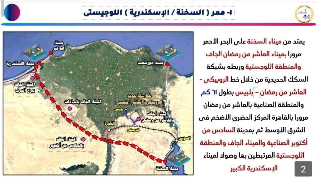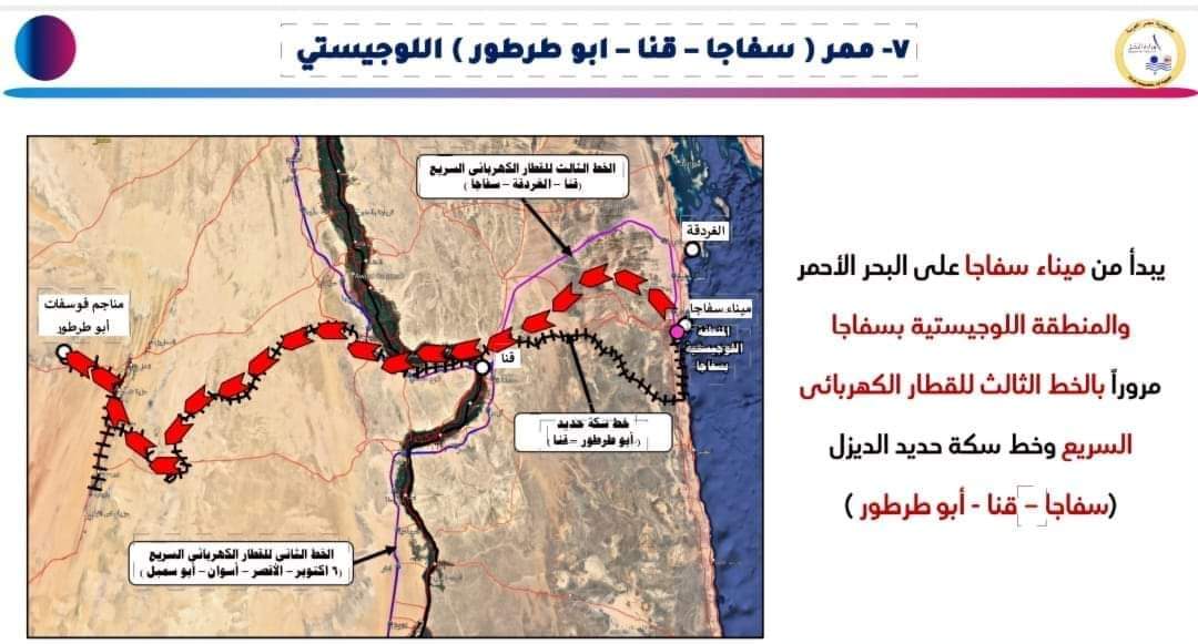 في إطار خطة الدولة للتنمية المستدامة 2030  وتنفيذاً لتوجيهات الرئيس عبدالفتاح السيسي  رئيس الجمهورية بتحويل مصر الى مركز اقليمي للنقل واللوجستيات وتجارة الترانزيت و تطوير منظومة النقل على مستوى الجمهورية  و لتحقيق هذا الهدف فإنه تم التخطيط لإنشاء عدد 7 ممرات لوجستية متكاملة جاري تنفيذها لربط مناطق الإنتاج (الصناعي – الزراعي – التعديني) بالموانئ البحرية أو ربط الموانئ البحرية على البحر الأحمر بالموانئ البحرية على البحر المتوسط وخدمة المجتمعات العمرانية الجديدة بواسطة شبكة من السكة الحديدية (ديزل / قطار كهربائي سريع) أو شبكة الطرق الرئيسية مروراً بالموانئ الجافة والمناطق اللوجستية الواقعة على هذه الممرات.