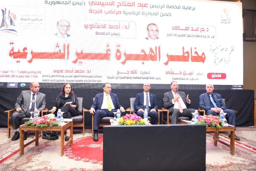 وقد تلى ذلك قيام المحافظ و نائب الوزير وبمشاركة السفيرة  نائلة جبر رئيسة اللجنة الوطنية التنسيقية لمكافحة الهجرة غير الشرعية والاتجار في البشر بزيارة إلى جامعة أسيوط، حيث استقبلهم الدكتور أحمد المنشاوي رئيس الجامعة، فيما أعقب ذلك عقد ندوة توعوية لعدد كبير من طلاب الجامعة تحت عنوان "مخاطر الهجرة غير الشرعية".