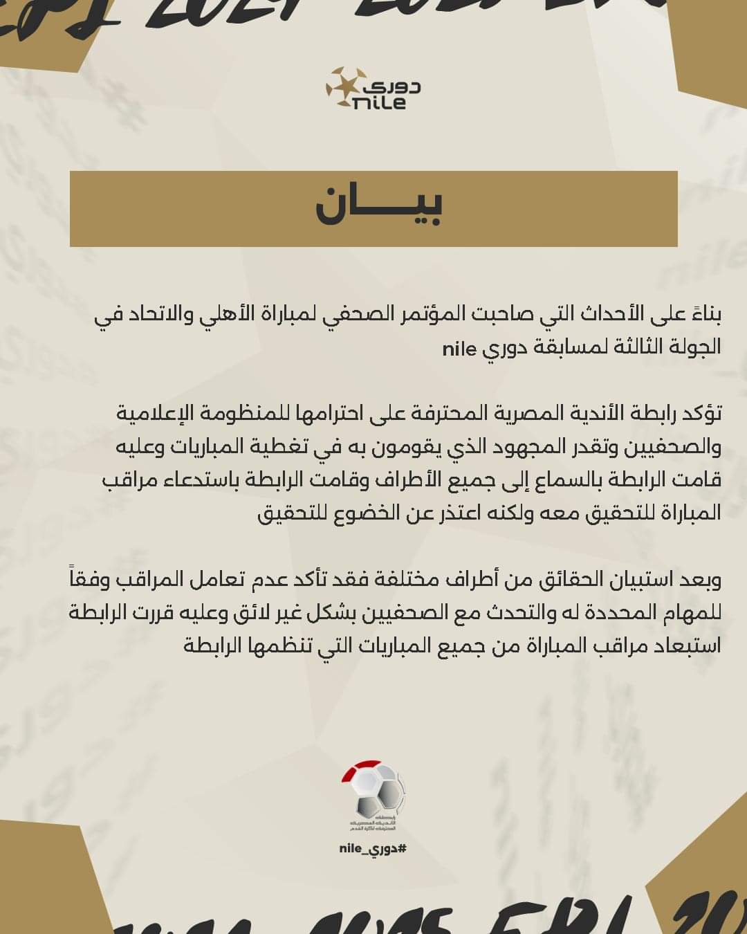 اعانت رابطة الأندية المحترفة المصرية عن استبعاد مراقب مباراة الأهلي والاتحاد من جميع المباريات التي تنظمها الرابطة وفقاً لأحداث اللقاء الذي جمع بين الفريقين وحسمه التعادل بهدف لكل منهما.