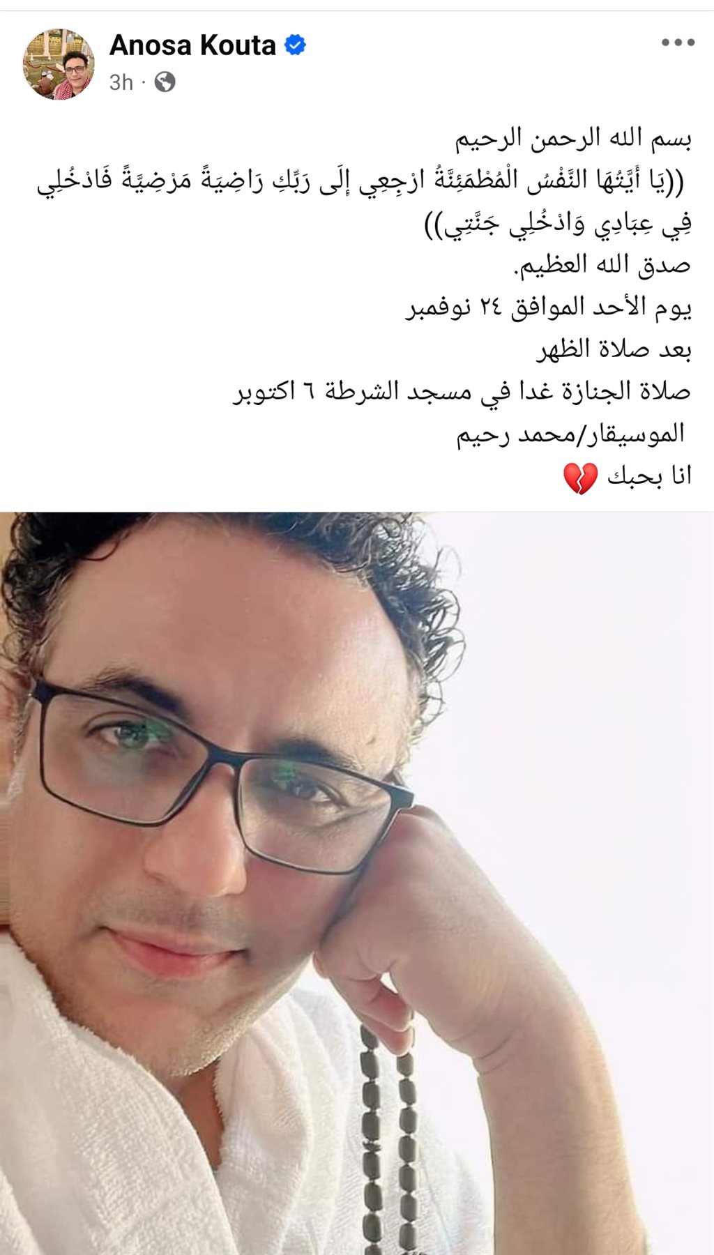 وكتبت زوجة الملحن محمد رحيم، عبر صفحتها قائلة : "بسم الله الرحمن الرحيم (يَا أَيَّتُهَا النَّفْسُ الْمُطْمَئِنَّةُ ارْجِعِي إِلَى رَبِّكِ رَاضِيَةً مَرْضِيَّةً فَادْخُلِي فِي عِبَادِي وَادْخُلِي جَنَّتِي) صدق الله العظيم.. يوم الأحد الموافق 24 نوفمبر بعد صلاة الظهر صلاة الجنازة في مسجد الشرطة 6 أكتوبر على الموسيقار محمد رحيم.. أنا بحبك".