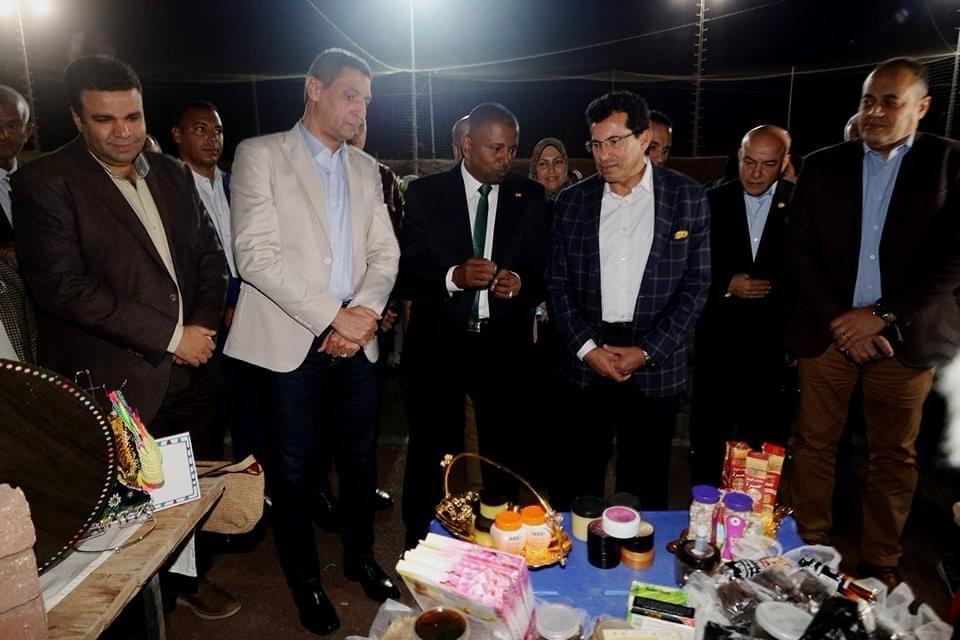 بدأ الوزير والمحافظ بتفقد معرض المنتجات والمشغولات النوبية، والتي تعبر عن ثقافة وتراث أرض النوبة، وهي صناعة يدوية بأيدي السيدات النوبية، والمشروبات وأدوات الزينة والحلي وأدوات إعداد الطعام.