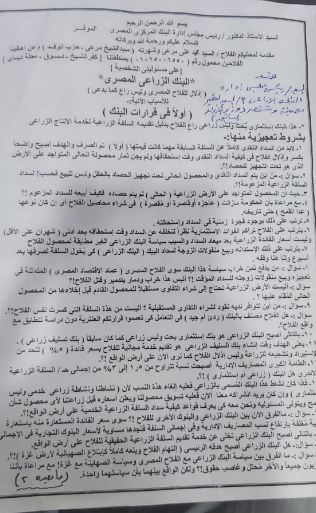 وأوضح مقدم الشكوى محمد علي مرعي، بأن هذا البنك استثماري بحت وليس زراعى، راع للفلاح بدليل تقديمه السلفة الزراعية لخدمة الإنتاج الزراعي.