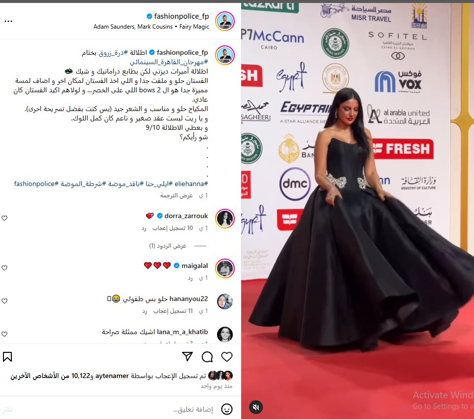 وجاء تعليق إيلي حنا مؤيد لذوق درة وحسن اختيارها، قائلًا: "إطلالة درة زروق بختام مهرجان القاهرة السينمائي إطلالة أميرات ديزني لكن بطابع دراماتيك و شيك".