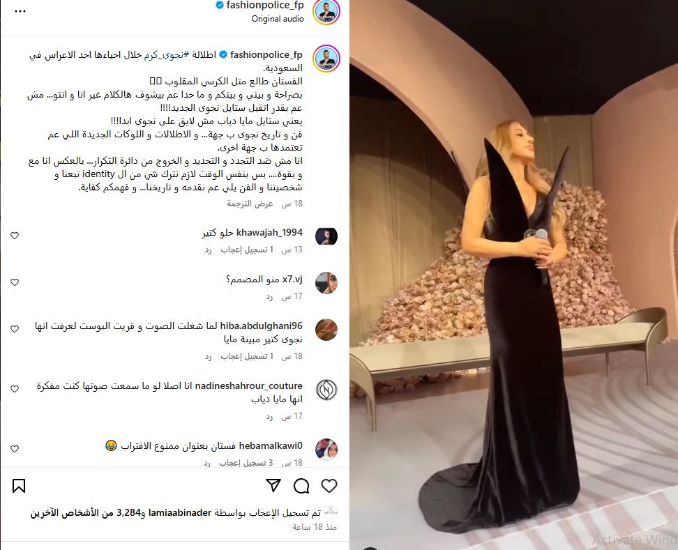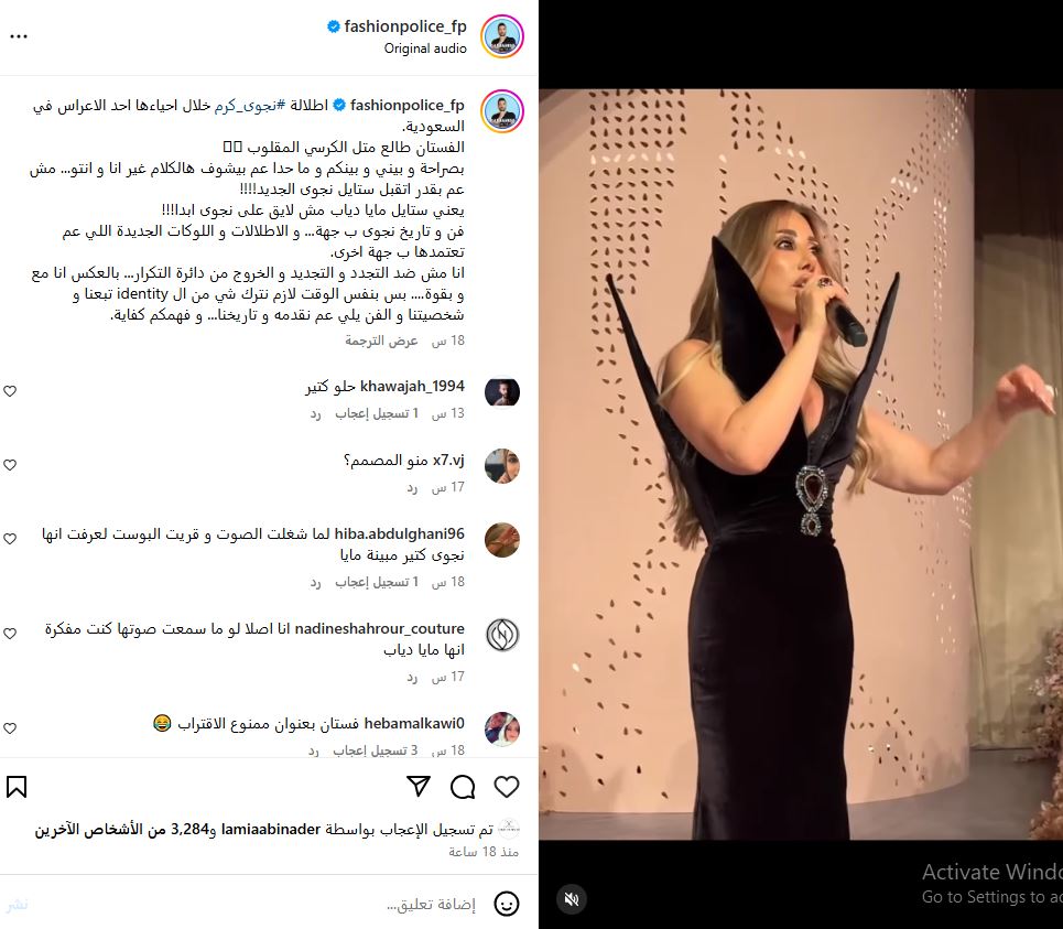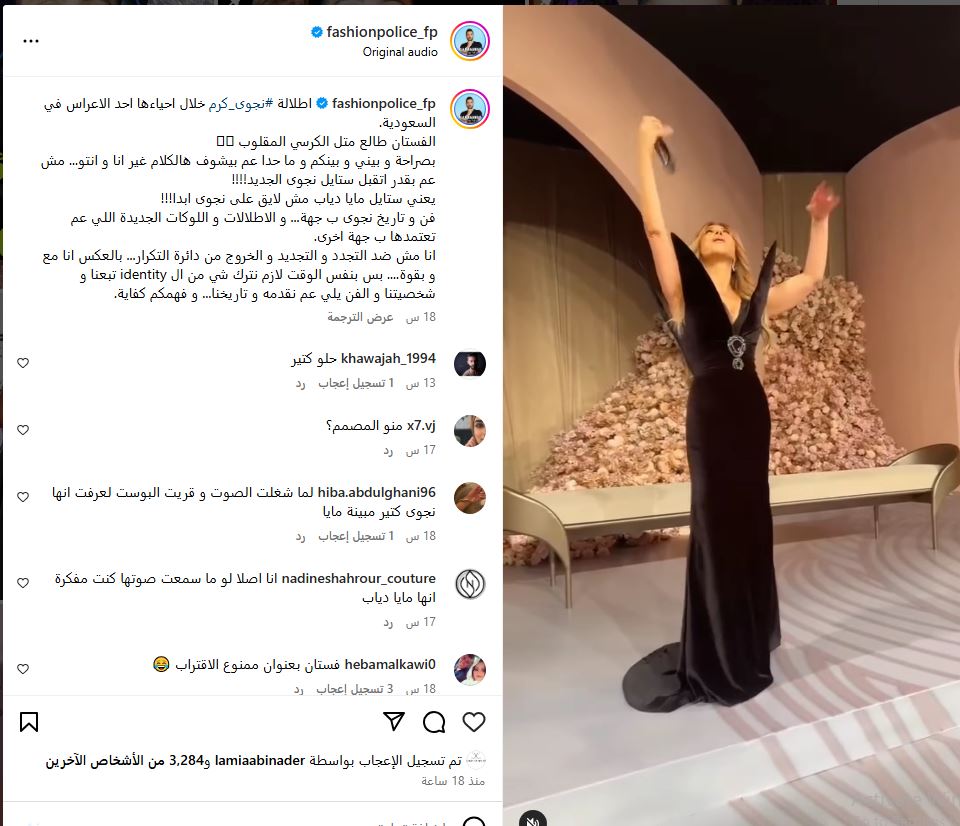 وجاء تعليق إيلي حنا عبر الصفحة الرسمية لشرطة الموضة معارض لذوقها، قائلًا: "إطلالة نجوى كرم خلال إحيائها أحد الأعراس في السعودية، الفستان طالع متل الكرسي المقلوب".