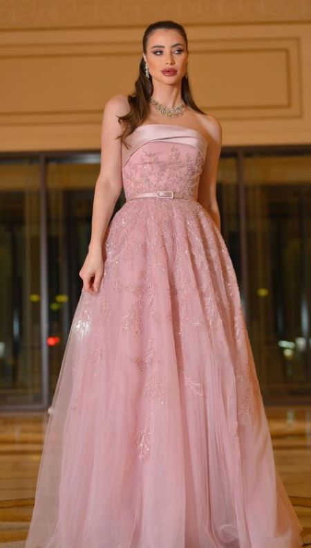 وبدت أنابيلا هلال بإطلالة ساحرة، مستوحاه من السندريلا، حيث ارتدت فستانًا مجسمًا من اعلى ومفنوشًا من أسفل، ينتمى لقصة الكب، صمم من قماش ناعم باللون البينك الفاتح يتوسطه حزام رفيع حول خصرها.