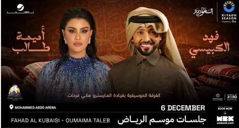 يقام حفل فهد الكبيسي وأميمة طالب في الـ 5 ديسمبر المقبل، على مسرح محمد عبده أرينا، مع الفرقة الموسيقية بقيادة المايسترو هاني فرحات.