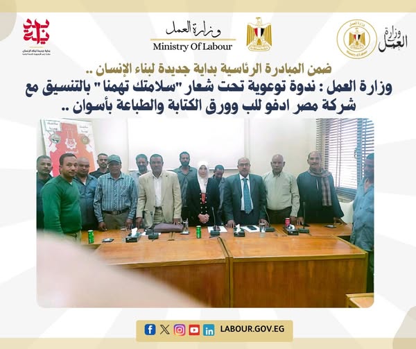 وزارة العمل تنظم ندوة "سلامتك تهمنا" بالتنسيق مع شركة مصر إدفو بأسوان