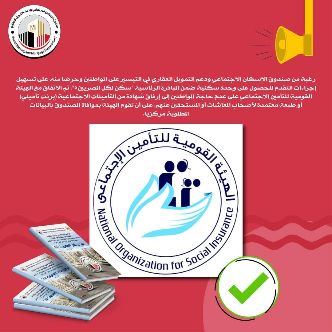 وبحسب البيان، فإنه تم الاتفاق بين الهيئة القومية للتأمين الاجتماعي، وصندوق الإسكان الاجتماعي ودعم التمويل العقاري؛ لتوفير البيانات المطلوبة مركزيًا مباشرة من الهيئة إلى الصندوق، دون الحاجة لتقديم هذه المستندات من المتقدمين.