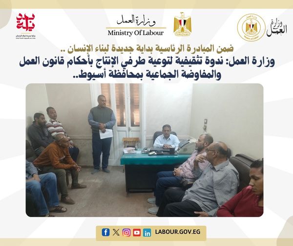 نظمت مديرية العمل بمحافظة أسيوط، ندوة تثقيفية لمناقشة وشرح أحكام قانون العمل رقم 12 لسنة 2003، حيث قامت بتنفيذها إدارة المفاوضة الجماعية، ومكتب علاقات عمل أسيوط، وذلك للعاملين بـ"الجمعية التعاونية الإنتاجية لنقل البضائع بالسيارات" بأسيوط والتي شارك فيها عدد (20) من العاملين بالجمعية.