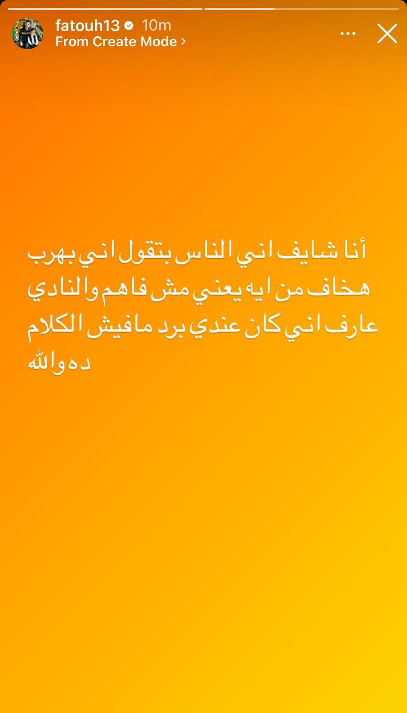 وكتب اللاعب عبر حسابه الرسمي على موقع التواصل الاجتماعي " انستجرام" :" أنا شايف إن الناس بنقول إني بهرب، هخاف من أيه يعني مش فاهم، والنادي عارف إني كان عندي برد، مفيش الكلام ده والله".